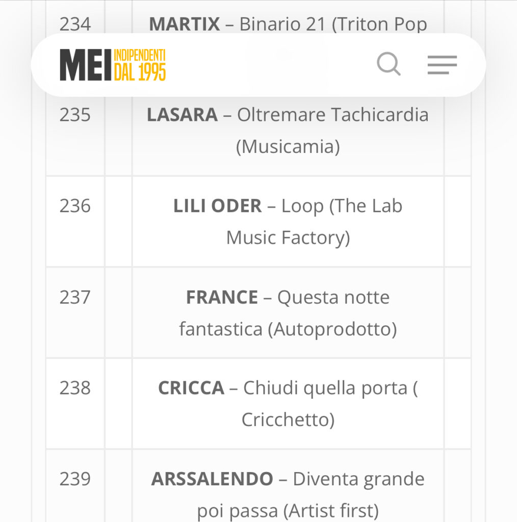 Siamo orgogliosi di annunciare che il nostro artista France è stato inserito nella prestigiosa classifica IndieMusicLike, la più longeva piattaforma della musica indipendente in Italia, che celebra la sua 21ª stagione. Il brano di France entra così a far parte di una selezione che viene diffusa su oltre 300 radio, la playlist Spotify IML-MEI, e su importanti riviste e […]