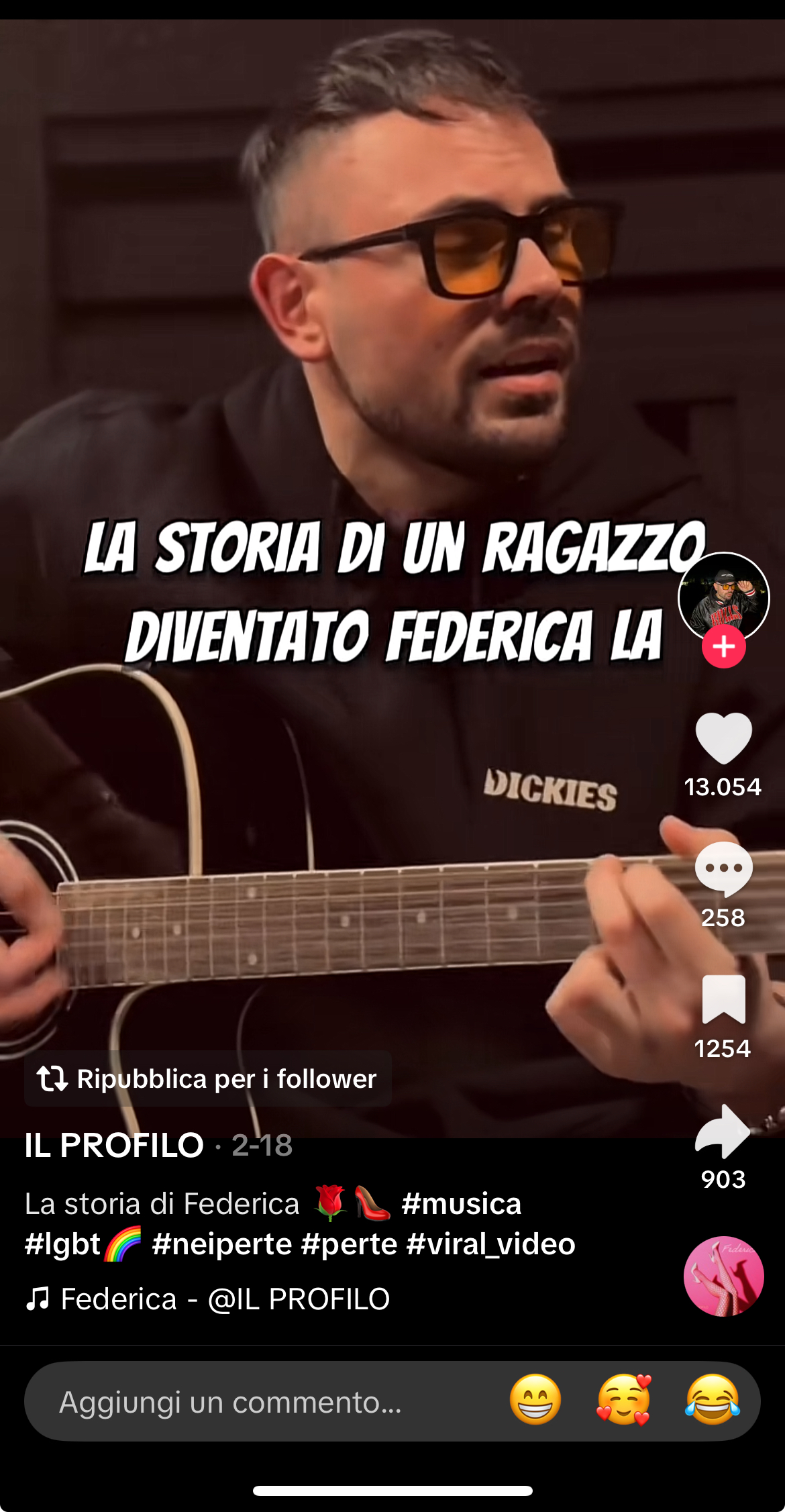 Il brano ‘Federica’ di Lorenzo Toma, in arte ‘Il Profilo’, sta spopolando su TikTok e Instagram, diventando virale e raccogliendo il supporto di tanti fan. Con questo brano, Lorenzo lancia un potente messaggio di libertà, celebrando l’amore in tutte le sue sfumature, senza etichette né barriere. ‘Federica’ è un inno alla verità di essere se stessi, senza compromessi, e il suo successo dimostra l’appeal di un messaggio autentico e senza filtri.